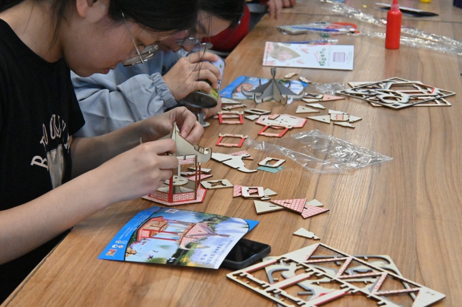 微型纳凉亭搭实践活动更是将理论与实践紧密结合。同学们仔细研究设计图纸到搭建成型,从榫卯构件的精准拼接,到屋面瓦片的有序铺设,每个环节均需细致规划、精密操作。随着纳凉亭落成,传统建筑美学与青春活力在校园中相映成趣。参与学生感慨:“古建筑结构的力学巧思恰似人际交往中的包容与支撑,唯有相互配合、彼此借力,方能构建稳固而温暖的心灵共同体。”