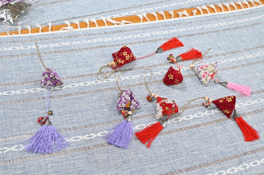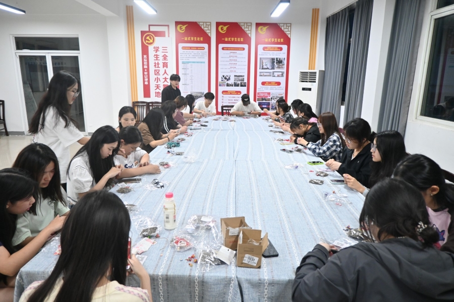5月27日晚,学生社区4号楼二楼党群服务中心活动室内灯火通明,30余名学生围坐一堂,以针线为媒、彩绳为介,亲手缝制艾草香囊、编织五彩手绳。活动中,同学们将传统技艺与现代审美融合创作,制作出了一个又一个精美的香囊。香囊里装的不仅是艾草,更是对传统文化的敬畏。