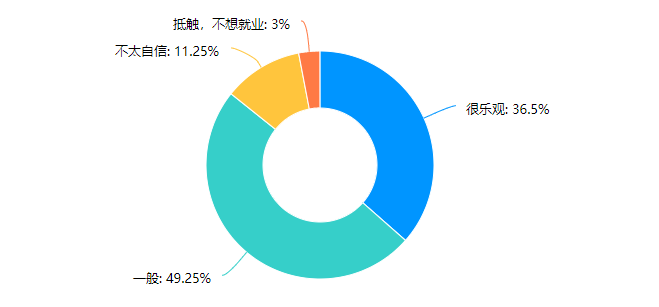 调查结果显示,85.75%的学生面对就业时心态较为平稳,但是仍有少部分学生对就业表示不自信或者抵触,在调查中,36.5%的学生显示出乐观的态度,49.25%的学生认为自己处于一般状态,11.25%的学生则显得缺乏自信,另外3%的学生表现出抵触情绪,不愿意参与就业(见图2)。由此可见,高校与就业老师应开展针对性摸排工作,向特定学生提供就业心理指导与就业技能培训等帮助。